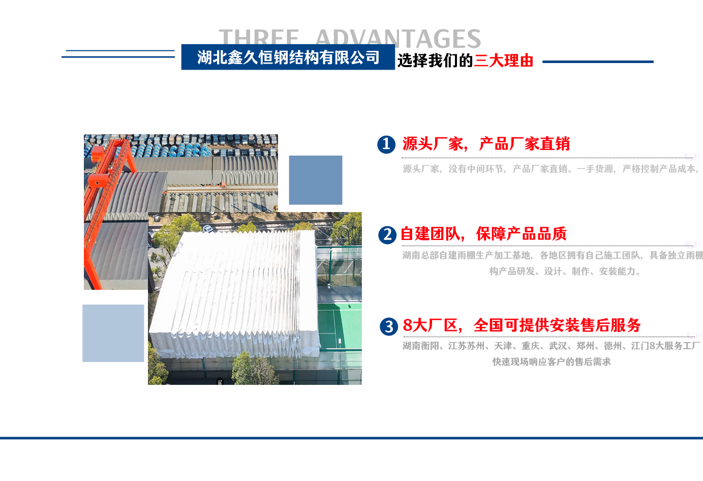 湖北鑫久恒鋼結(jié)構(gòu)有限公司是一家電動(dòng)雨棚、膜結(jié)構(gòu)車棚研發(fā),生產(chǎn)銷售,施工安裝于一體的專業(yè)鋼結(jié)構(gòu)科技公司,主要產(chǎn)品有伸縮雨棚,電動(dòng)雨棚,膜結(jié)構(gòu)車棚等。  湖南地區(qū)職員目前有80多人,占地面積20000平方米,廠房面積15600平方米,配備先進(jìn)的生產(chǎn)流水線,使每件品質(zhì)產(chǎn)品的堅(jiān)實(shí)基礎(chǔ)。  公司在蘇州、天津、重慶、武漢、德州、烏魯木齊、江門均設(shè)有服務(wù)工廠,總?cè)藛T共300多人,擁有專業(yè)的技術(shù)團(tuán)隊(duì),配備先進(jìn)的設(shè)備和流水線生產(chǎn),產(chǎn)能高,貨源充足,發(fā)貨速度快,服務(wù)區(qū)域廣。  移動(dòng)伸縮棚適用于通道臨時(shí)倉儲(chǔ)、戶外運(yùn)動(dòng)遮陽、污水池遮蓋、能源交通、熱力化工、礦山、船舶制造及市政建設(shè)、物流、碼頭等領(lǐng)域的構(gòu)件制作加工,成品半成品存放、倉庫、野外儀器設(shè)備操作用房等。尤其是對(duì)工廠發(fā)貨、倉儲(chǔ)臨時(shí)遮雨防嗮,梅雨期較長、建設(shè)周期較短的工程施工等特別適用。還可根據(jù)用戶需求量身定制、適合企業(yè)所需不同款式的產(chǎn)品。  我公司堅(jiān)持“誠信社會(huì)為本,客戶滿意為榮”的經(jīng)營理念,做到質(zhì)量把控,嚴(yán)格管理,精益求精,恪守承諾。使鑫久恒逐步走向成熟,其系統(tǒng)化、專業(yè)化日趨完善。以專業(yè)的技術(shù)、科學(xué)的管理,更高的產(chǎn)品質(zhì)量,優(yōu)良的企業(yè)信譽(yù),真誠的客戶服務(wù),靈活多樣的經(jīng)營方式和務(wù)實(shí)創(chuàng)新的企業(yè)精神愿與社會(huì)各界攜手合作,為推動(dòng)智能鋼結(jié)構(gòu)建筑事業(yè)的發(fā)展而不斷努力。...